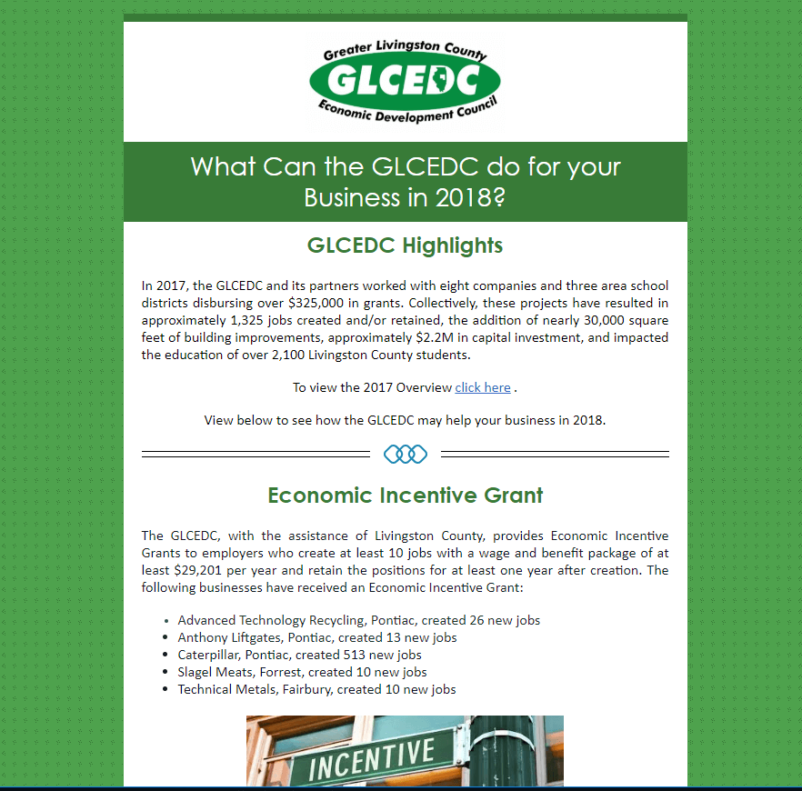 In 2017, the GLCEDC and its partners worked with eight companies and three area school districts disbursing over $325,000 in grants. Collectively, these projects have resulted in approximately 1,325 jobs created and/or retained, the addition of nearly 30,000 square feet of building improvements, approximately $2.2M in capital investment, and impacted the education of over 2,100 Livingston County students…