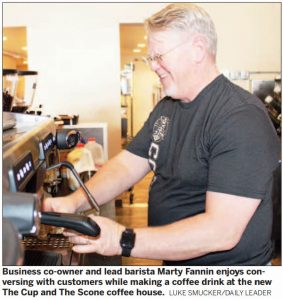 After months of planning and preparation, business owners Scott and Jennifer Cranford and co-owner Marty Fannin opened The Cup and The Scone coffee house, located at 213 W. Madison St., on Feb. 9.