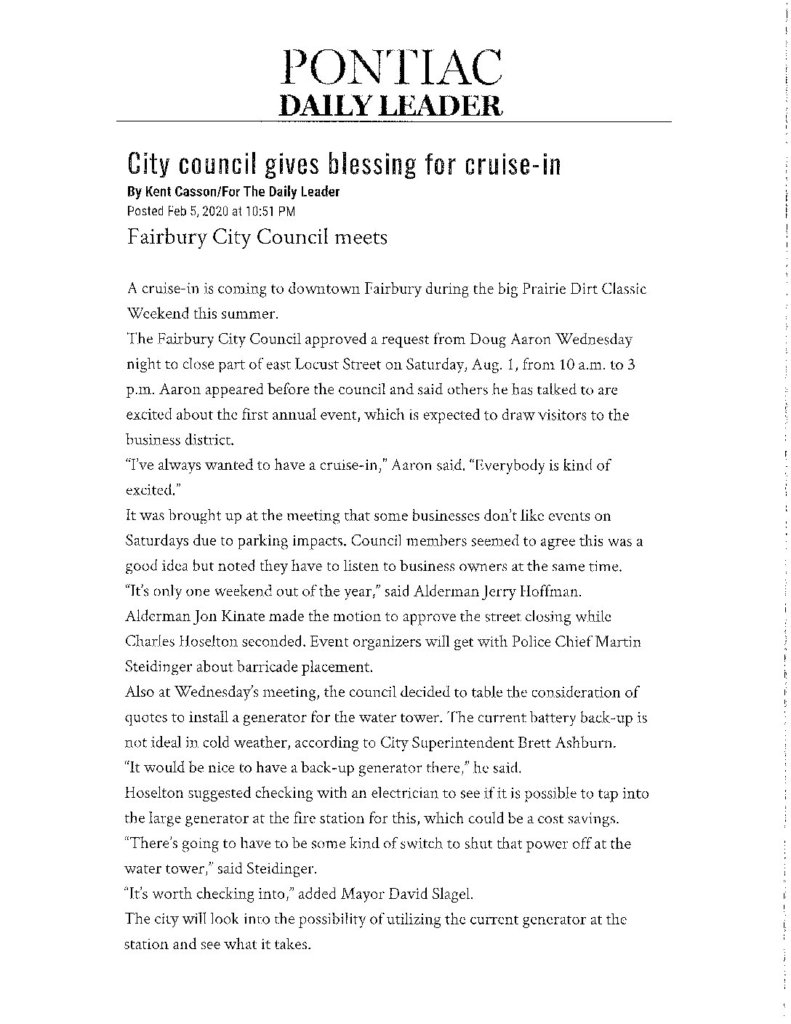 A cruise-in is coming to downtown Fairbury during the big Prairie Dirt Classic Weekend this summer.