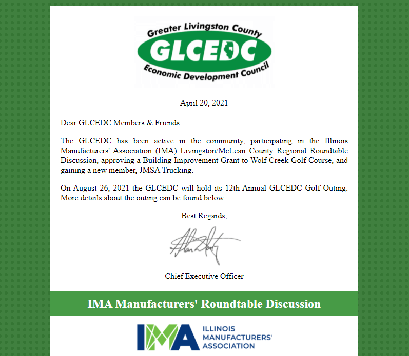 The GLCEDC has been active in the community, participating in the Illinois Manufacturers’ Association (IMA) Livingston/McLean County Regional Roundtable Discussion, approving a Building Improvement Grant to Wolf Creek Golf Course, and gaining a new member, JMSA Trucking.