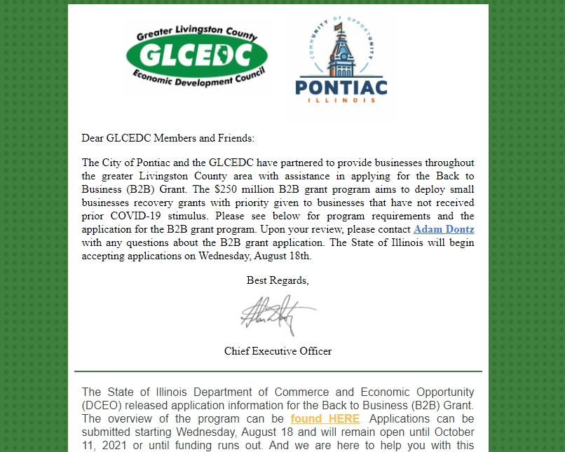 The City of Pontiac and the GLCEDC have partnered to provide businesses throughout the greater Livingston County area with assistance in applying for the Back to Business (B2B) Grant.