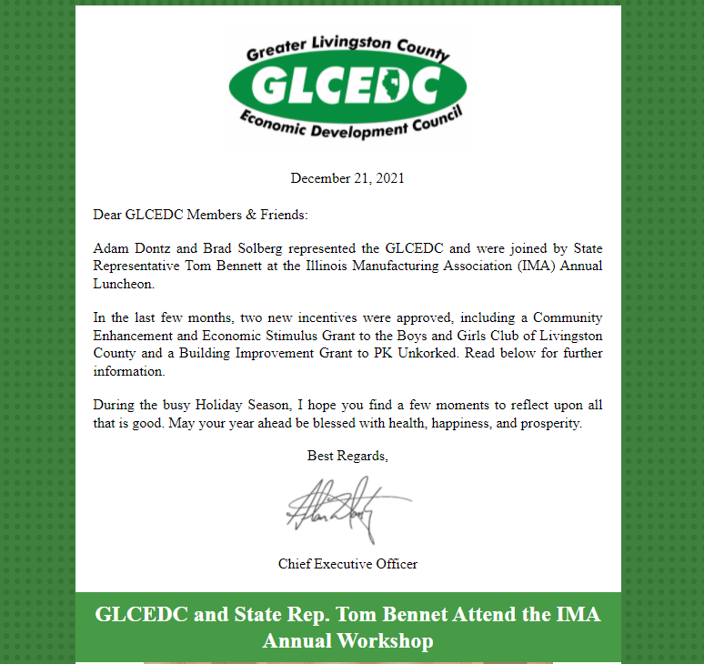 Adam Dontz and Brad Solberg represented the GLCEDC and were joined by State Representative Tom Bennett at the Illinois Manufacturing Association (IMA) Annual Luncheon.